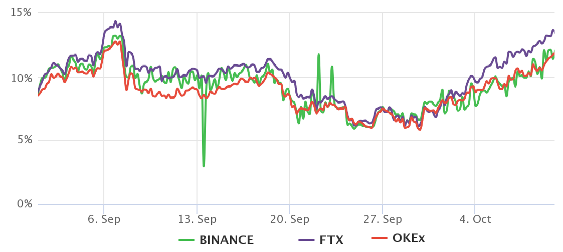 Ví dụ, vào đầu tháng 9, lãi suất basis dao động từ 9% đến 13%, cho thấy sự tự tin, nhưng vào ngày 29 tháng 9, ngay trước khi Bitcoin bứt phá trên 45.000 USD, phí bảo hiểm tương lai 3 tháng ở mức 6,5%. Nói chung, các chỉ số dưới 5% thường được coi là giảm giá, vì vậy việc đọc 6,5% vào cuối tháng 9 có nghĩa là các nhà đầu tư đang thể hiện sự tự tin thấp.