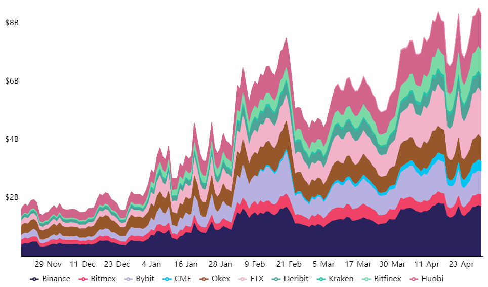 Khi Ether (ETH) kiếm được 2.800 đô la vào ngày 29 tháng 4, thì lãi suất mở tương lai của nó cũng tăng theo. Con số 8,5 tỷ đô la đánh dấu mức tăng 52% hàng tháng và cho thấy hoạt động giao dịch mạnh mẽ đằng sau sự tăng giá.