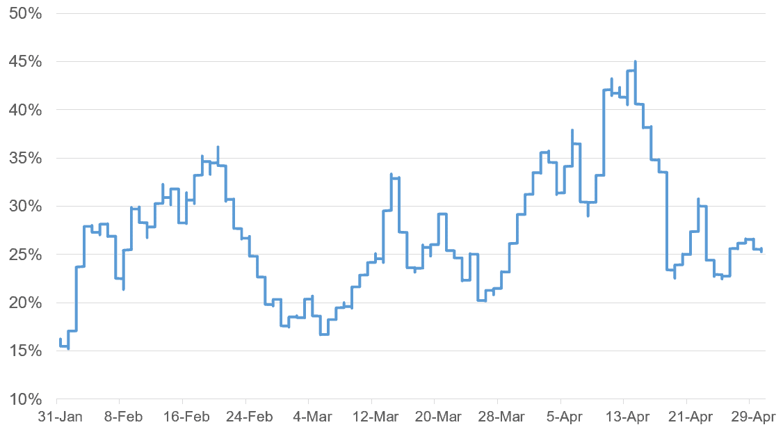 Như biểu đồ trên hiển thị, tỷ lệ tài trợ 8 giờ gần đây đạt mức cao nhất là 0,18% vào ngày 14 tháng 4, tương đương với 3,8% mỗi tuần. Mặc dù điều này chắc chắn góp phần vào cơ sở hợp đồng tương lai hàng tháng rất lạc quan, tác động đã hoàn toàn mờ nhạt do tỷ lệ cấp vốn đã lơ là trong vài ngày qua.