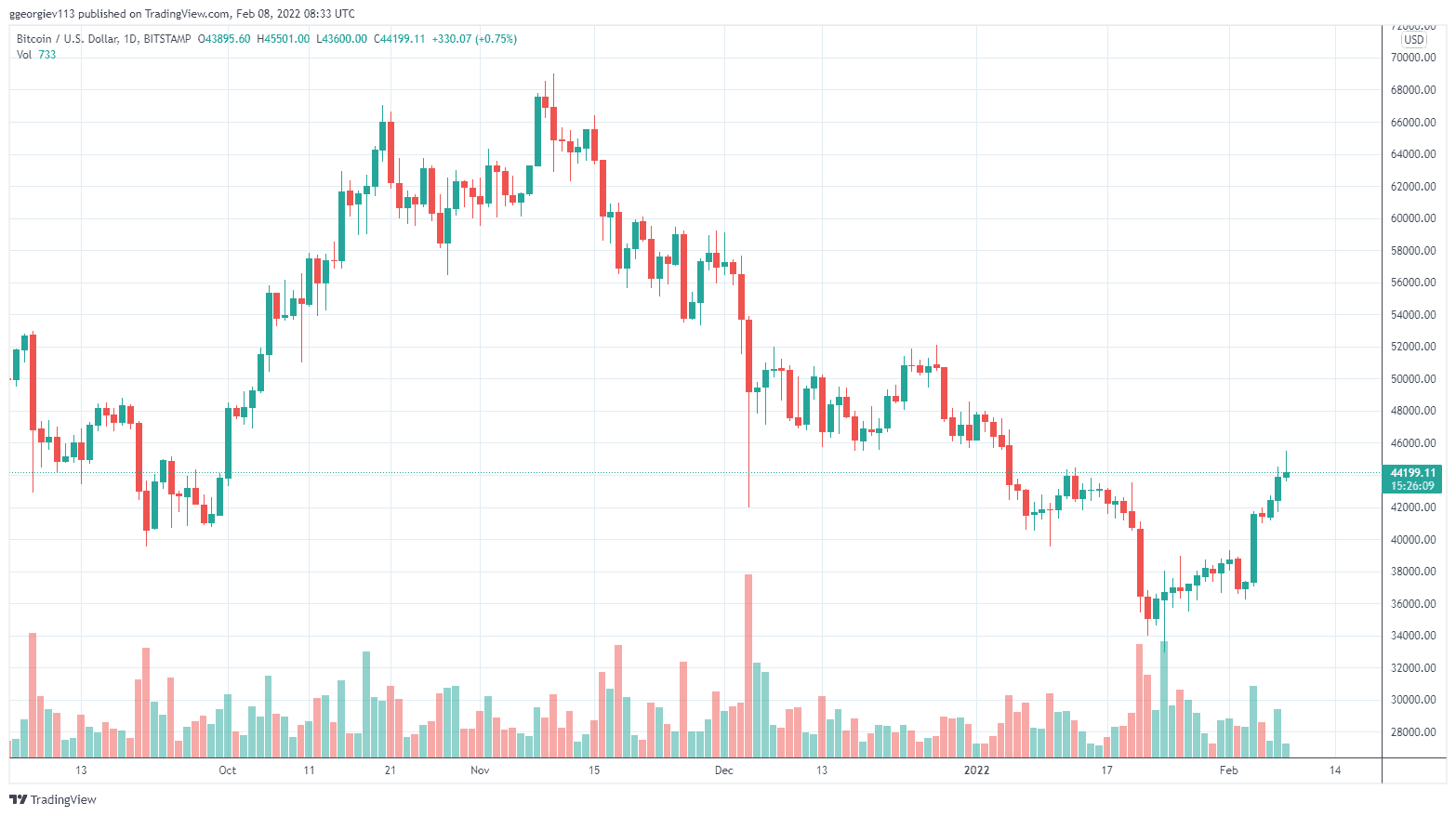 Trên thực tế, giá đã vượt qua mức 45 nghìn USD một thời gian ngắn trong phiên giao dịch hôm thứ Ba và đạt mức cao nhất là 45.500 USD. Kể từ đó, nó đã điều chỉnh và hiện đang ở mức khoảng 44,000 USD.