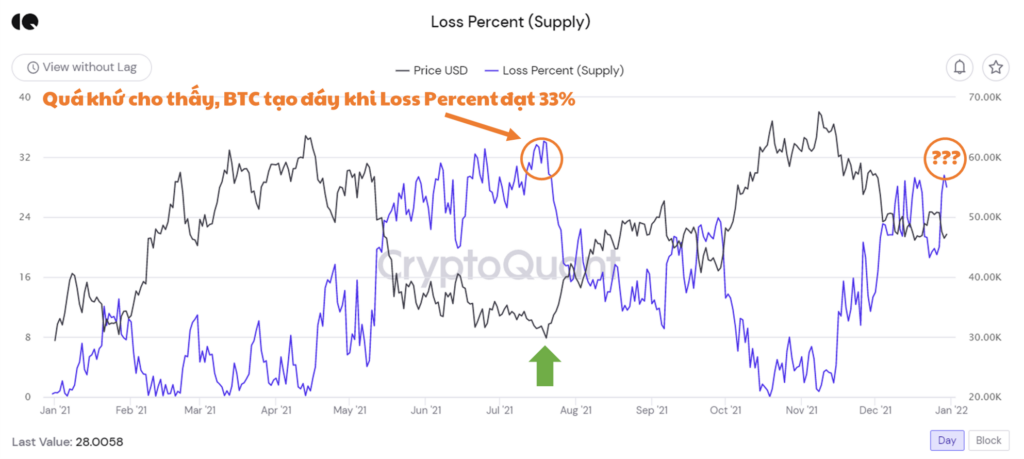 - Trong suốt năm 2021, mỗi khi tỷ lệ nguồn cung BTC chịu lỗ là 0% thì lúc đó giá BTC luôn thiết lập một đỉnh tạm thời. Và mối quan hệ nghịch biến này tương đối mật thiết. Hãy quan sát giá Bitcoin và Loss Percent của tháng 11/2021, Loss Percent về gần 0% đã dự báo chính xác đỉnh BTC tại vùng 69,000 USD.