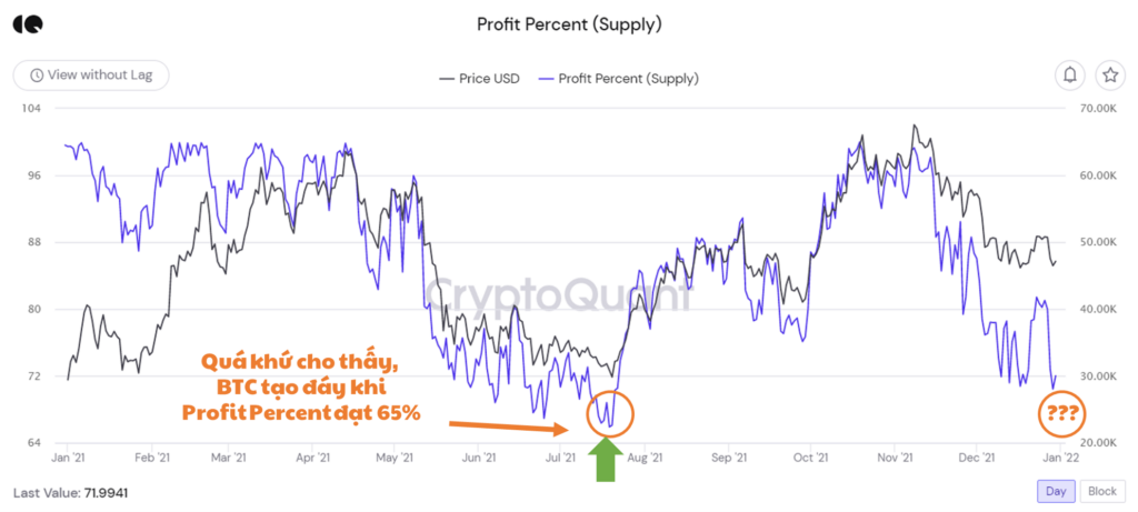 - Hiện tại tỷ lệ này đang là 72% trong khi giá BTC được giao dịch ở mức cao hơn trên 47,000 USD. Như vậy, theo tỷ lệ này thì có thể dự đoán giá BTC đã gần tạo đáy, nhưng đáy cao hơn.