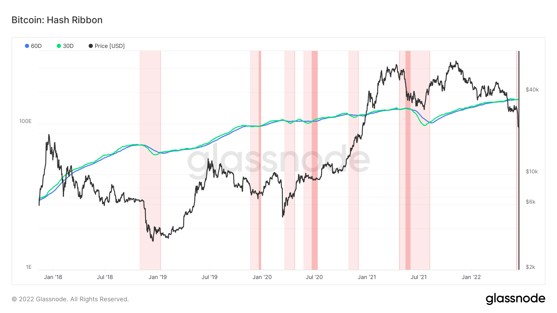Hash Ribbon sử dụng đường trung bình động 30 ngày và 60 ngày của tỷ lệ băm để xác định thời điểm xảy ra tình trạng đầu hàng của thợ đào. Khi 30 ngày tăng vượt qua 60 ngày, có thể giả định rằng “điều tồi tệ nhất” đã qua khi các thợ đào quay trở lại làm việc.