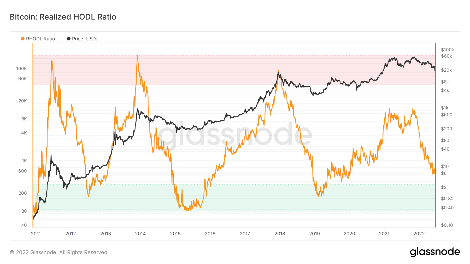 RHODL đặc biệt lấy tỷ lệ giữa nhóm thuần tập 1 tuần và 1-2 năm của chỉ số Realized Cap HODL Waves, chia số tiền cho thời điểm chúng di chuyển lần cuối (tính theo giá thực tế).