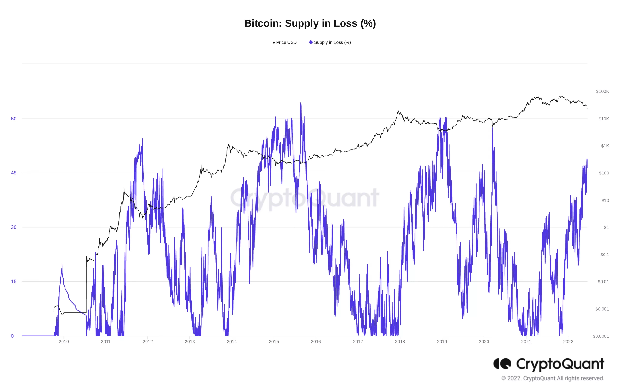 Nền tảng phân tích chuỗi trực tuyến CryptoQuant tiết lộ rằng tính đến ngày 16 tháng 6, chỉ 46% tổng nguồn cung BTC đang bị thua lỗ.