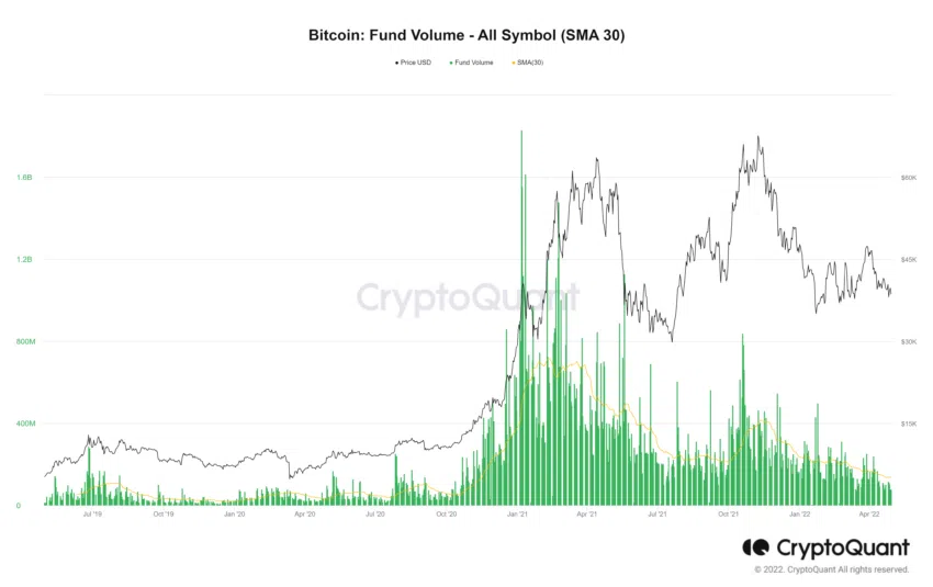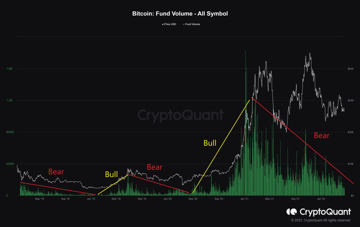 “Fund Volume” là dữ liệu tổng hợp khối lượng giao dịch các đồng coin trên sàn. Quan sát downtrend 2021 thì khối lượng giao dịch sôi động hơn, các nhà đầu tư hào hứng với việc bắt đáy hơn và đặt nhiều niềm tin hơn vào sự phục hồi.