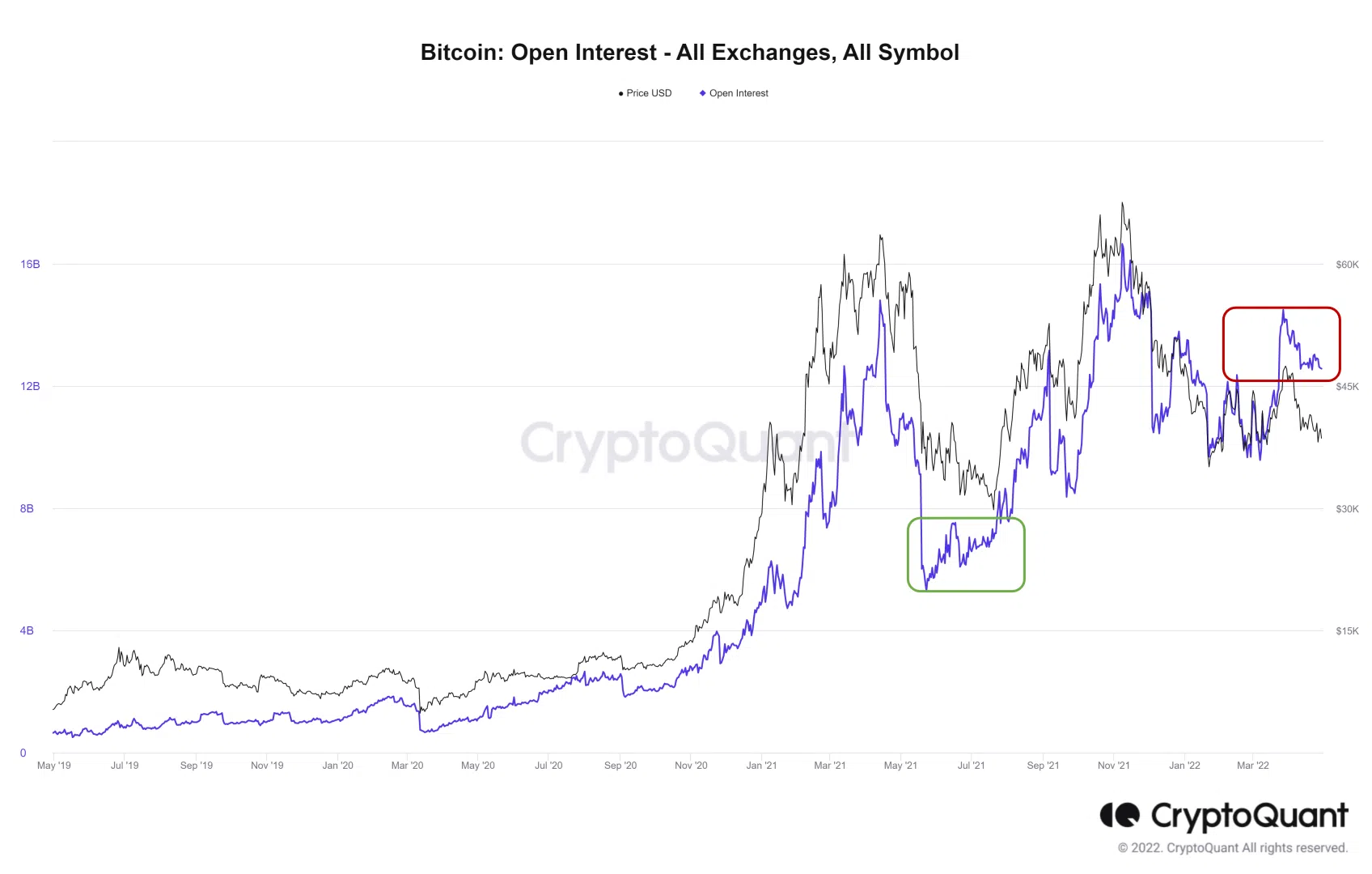 - Nhưng thị trường downtrend 2022 lại chứng kiến sự gia tăng của Open Interest. Tâm lý đầu tư không còn chú trọng và người ta bắt đầu chuyển vào phái sinh để đầu cơ trong ngắn hạn. Điều này rõ ràng không tạo động lực tăng giá.