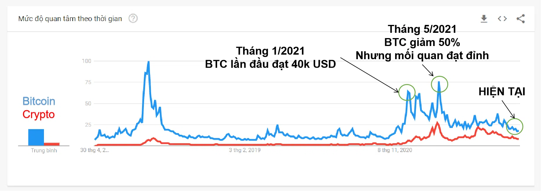 - Mối quan tâm tìm kiếm chủ đề về Bitcoin và Crypto thật sự bùng nổ kể từ sau 2018 là khi Bitcoin vượt 20,000 USD và nhanh chóng chạm mốc 40,000 USD lần đầu tiên. Mối quan tâm này tiếp tục kéo dài ngay cả khi Bitcoin suy giảm đến 50%. Có thể chính vì giai đoạn thị trường downtrend 2021 vẫn còn nhận được mối quan tâm lớn như vậy, nên Bitcoin mới đủ lực để tăng thêm một nhịp nữa và lập mốc ATH cao hơn trước một chút ở 69,000 USD.