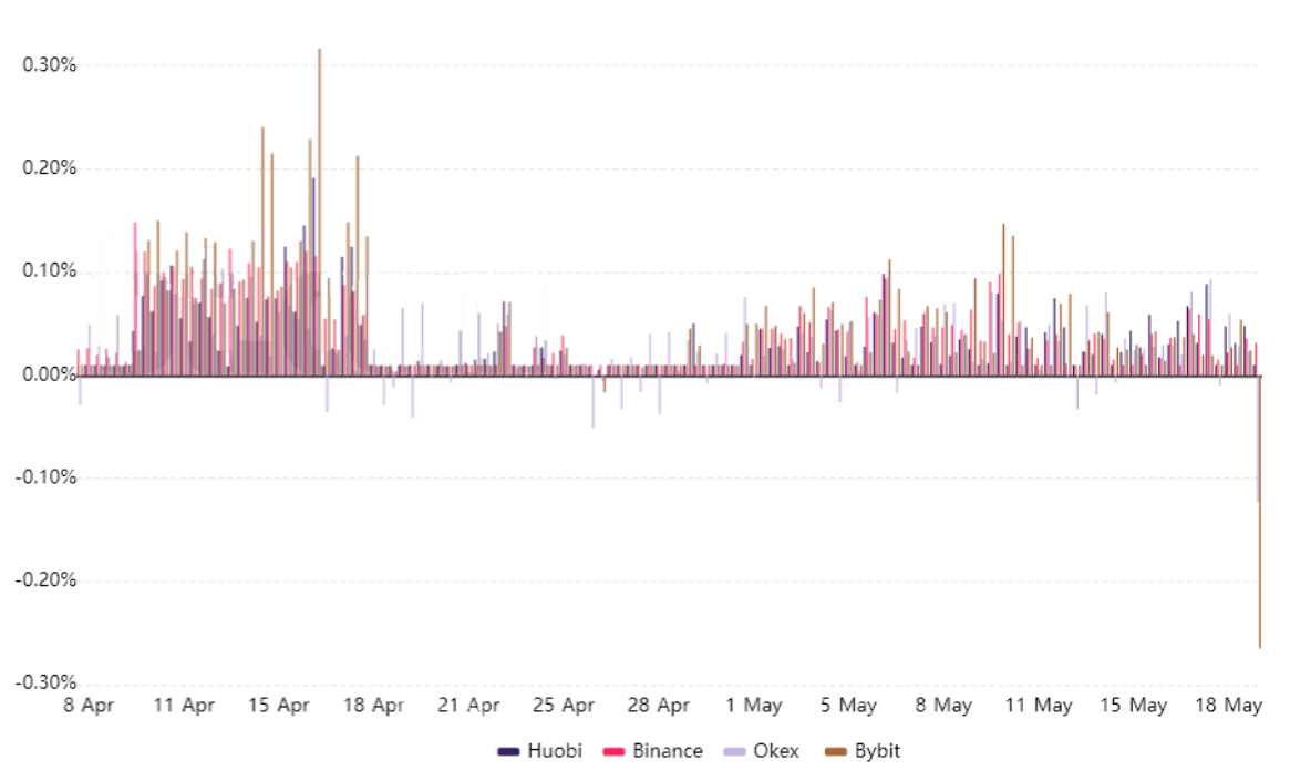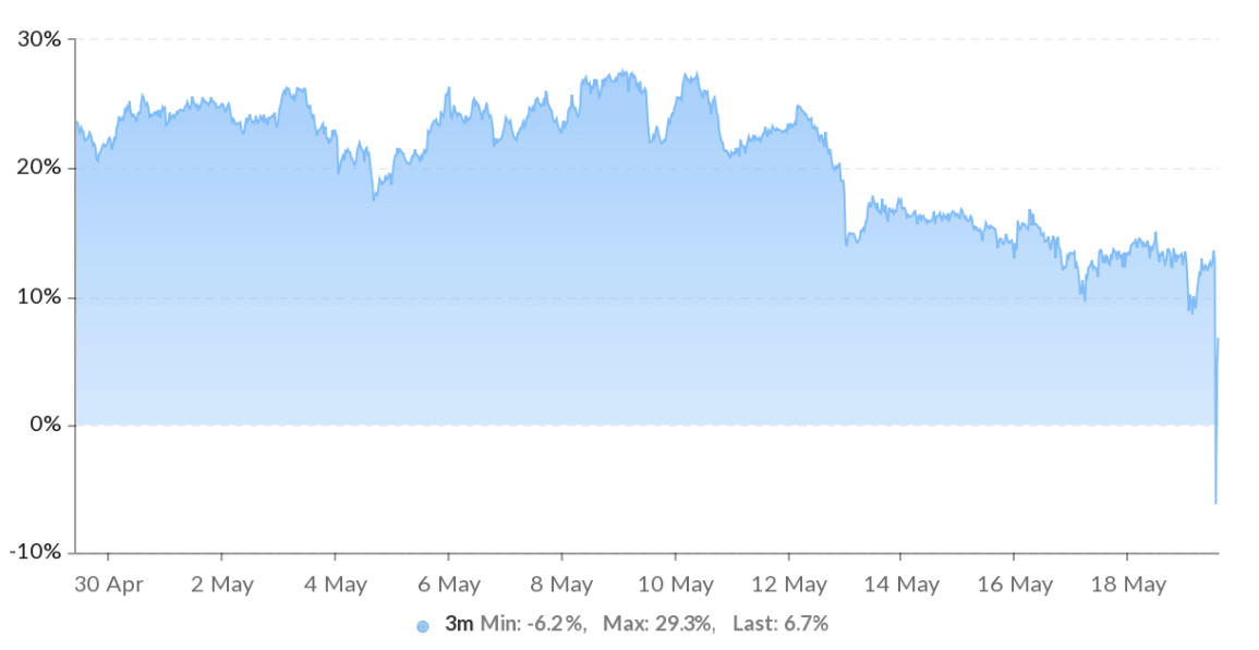 Trong vài tuần qua, chỉ báo này duy trì trên mức 8%, cho thấy sự tự tin. Tuy nhiên, trong thời gian giảm xuống 30.000 đô la vào ngày 19 tháng 5, tình hình đã thay đổi đáng kể khi sự thụt lùi xuất hiện lần đầu tiên sau một năm. Trong trường hợp này, thị trường kỳ hạn giao dịch thấp hơn giá giao ngay thông thường trên các sàn giao dịch – một tình huống rất đáng lo ngại.