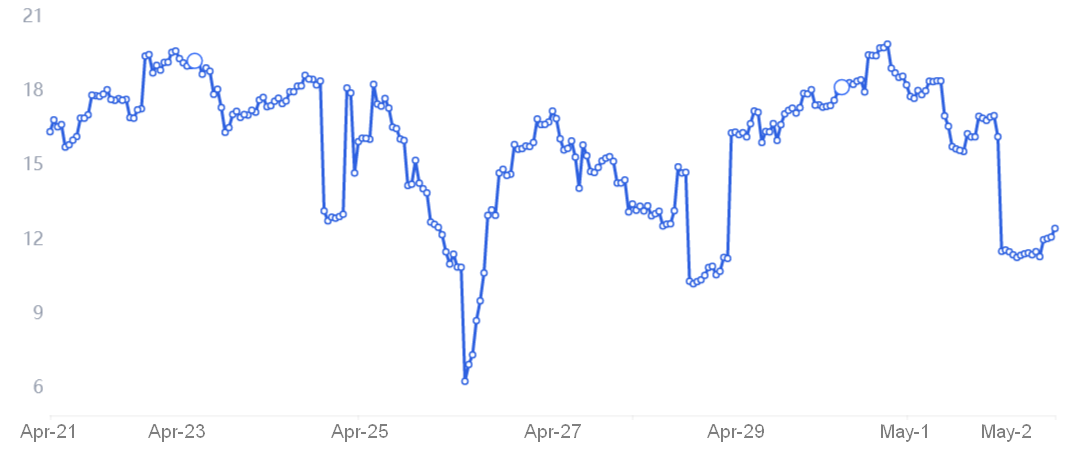 Biểu đồ trên cho thấy các trader gần đây đã vay nhiều Bitcoin hơn, khi tỷ lệ này giảm từ 20 vào ngày 30 tháng 4 xuống còn 12,5 hiện tại. Chỉ báo này càng cao, các trader chuyên nghiệp càng tự tin hơn với giá Bitcoin.