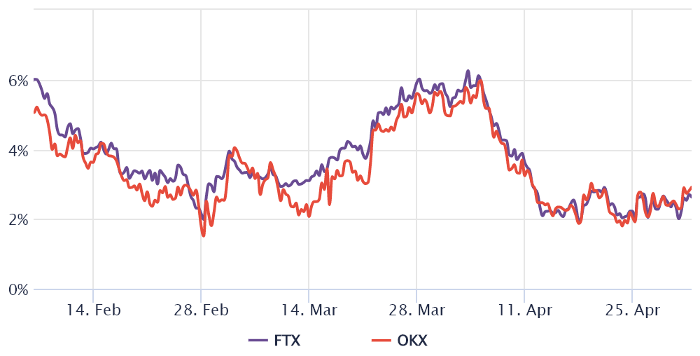 Không giống như hợp đồng vĩnh viễn, các hợp đồng tương lai theo lịch cố định này không có tỷ lệ cấp vốn, vì vậy giá của chúng sẽ khác rất nhiều so với các sàn giao dịch giao ngay thông thường. Tâm lý thị trường giảm khiến hợp đồng tương lai ba tháng giao dịch ở mức phí bảo hiểm hàng năm 5% hoặc thấp hơn (basis).
