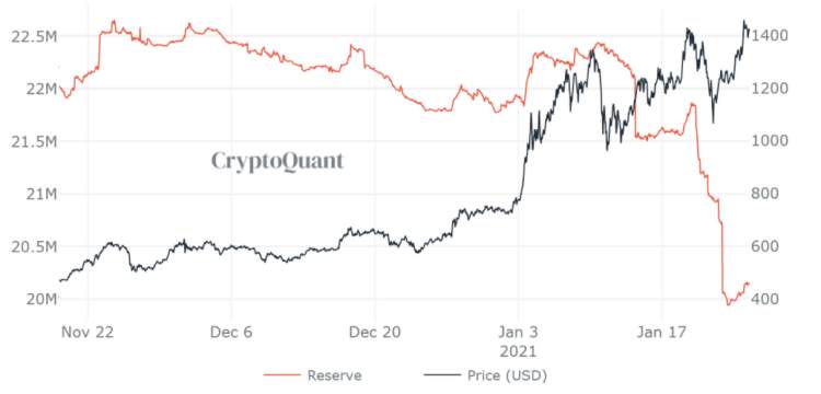 Như biểu đồ trên cho thấy, vào ngày 23 tháng 1, các sàn giao dịch tập trung đã đạt mức dự trữ Ether thấp nhất kể từ tháng 11 năm 2018.