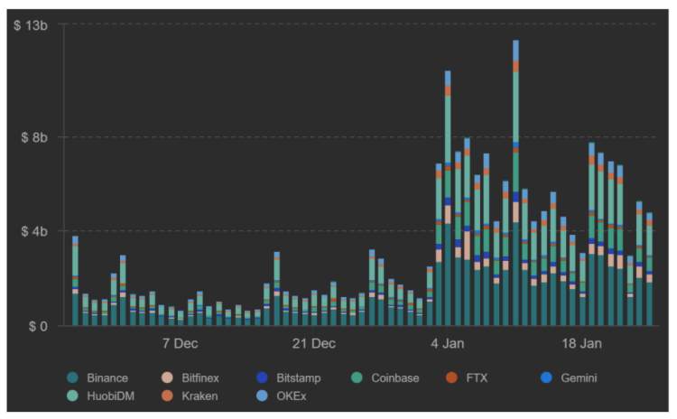 OKEx nổi bật với tư cách là các nhà giao dịch hàng đầu, tỷ lệ long-short đạt đỉnh ở mức 2.0, rất ưa chuộng các lệnh mua vào đầu giờ ngày 22 tháng 1, nhưng nó đã giảm cho đến ngày 24 tháng 1 và cuối cùng chạm đáy ở mức 1,05. Xu hướng bán ròng mạnh đã được quay trở lại ngày hôm nay khi các nhà giao dịch “buy dip” và chỉ báo này đã chuyển sang mức 1,17 có lợi cho các giao dịch mua.