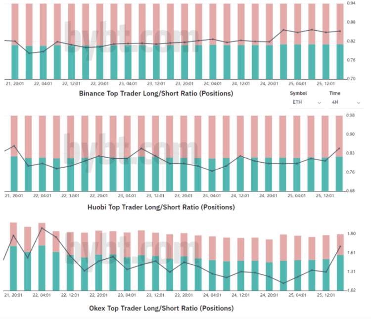 Chỉ số nhà giao dịch hàng đầu tại Binance và Huobi đã giữ gần như cùng một vị trí Ether trong vài ngày qua. Tỷ lệ trung bình của Huobi trong 30 ngày qua là 0,83 tỷ lệ long-short trong khi các nhà giao dịch tại Binance giữ mức trung bình 0,94. Việc đọc hiện tại ở mức 0,85 cho thấy một tâm lý tiêu cực nhẹ.