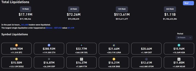 Cú sụt giảm mạnh chỉ trong 3 ngày khiến nhiều nhà đầu tư rơi vào tình cảnh bị thanh lý các lệnh dùng đỏn bẩy tài chính. Theo Coinglass, hơn 343.000 nhà đầu tư đã bị thanh lý lệnh trong 24 giờ qua. Tổng số tiền thiệt hại của các nhà đầu tư lên đến 1,1 tỷ USD.