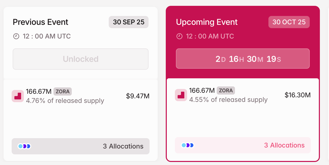 Vào ngày 30/10, Zora sẽ mở khóa 166.67 triệu token trị giá khoảng 16.3 triệu USD. Điều này chiếm 4.55% lượng cung được phát hành và nhắm đến các bên liên quan chính.