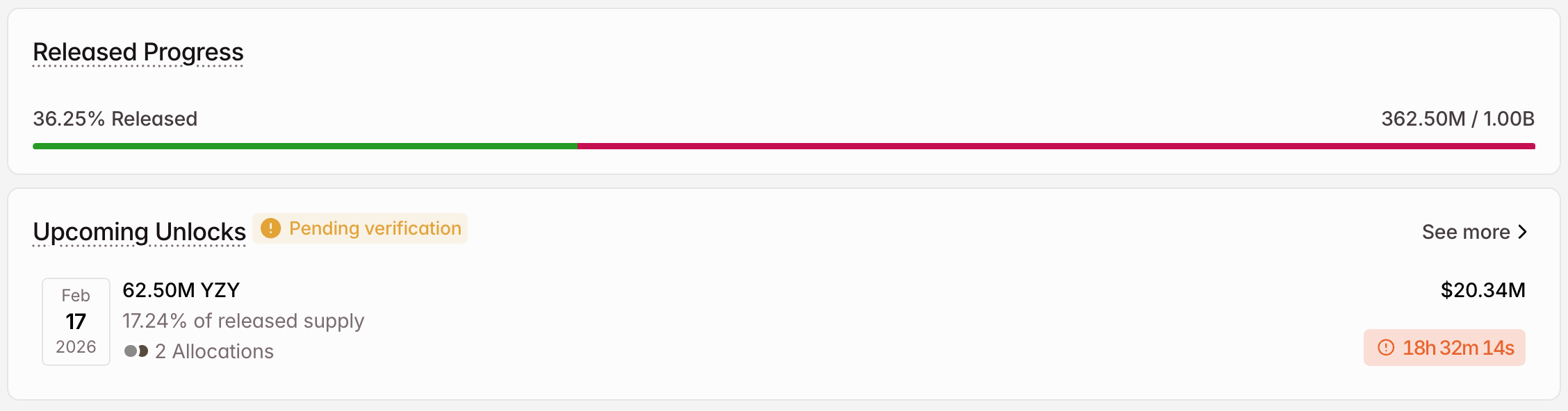 Ngày 17/02 tới, YZY sẽ mở khoá 62.5 triệu token, tương đương khoảng 20.34 triệu USD, chiếm 17.24% số lượng token đã phát hành.