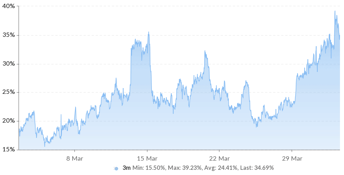 Lần đầu tiên kể từ ngày 5 tháng 2, chỉ báo tùy chọn lệch đang nghiêng về xu hướng tăng, mặc dù nó không còn xa ngưỡng trung lập âm 10%. Hơn nữa, chỉ báo “sợ hãi và tham lam” đã liên tục cải thiện trong năm tuần qua.