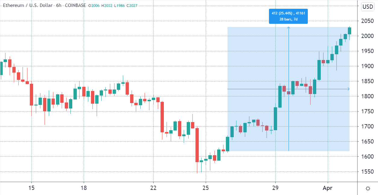 Một số nhà phân tích tin rằng việc chấp nhận thanh toán bằng stablecoin USD Coin (USDC) của Visa trên mạng Ethereum đã khởi đầu cho đợt phục hồi gần đây nhất. Những người khác cho rằng việc tăng giá Ether hiện tại là do sự đột phá “cấu trúc thị trường tam giác”.