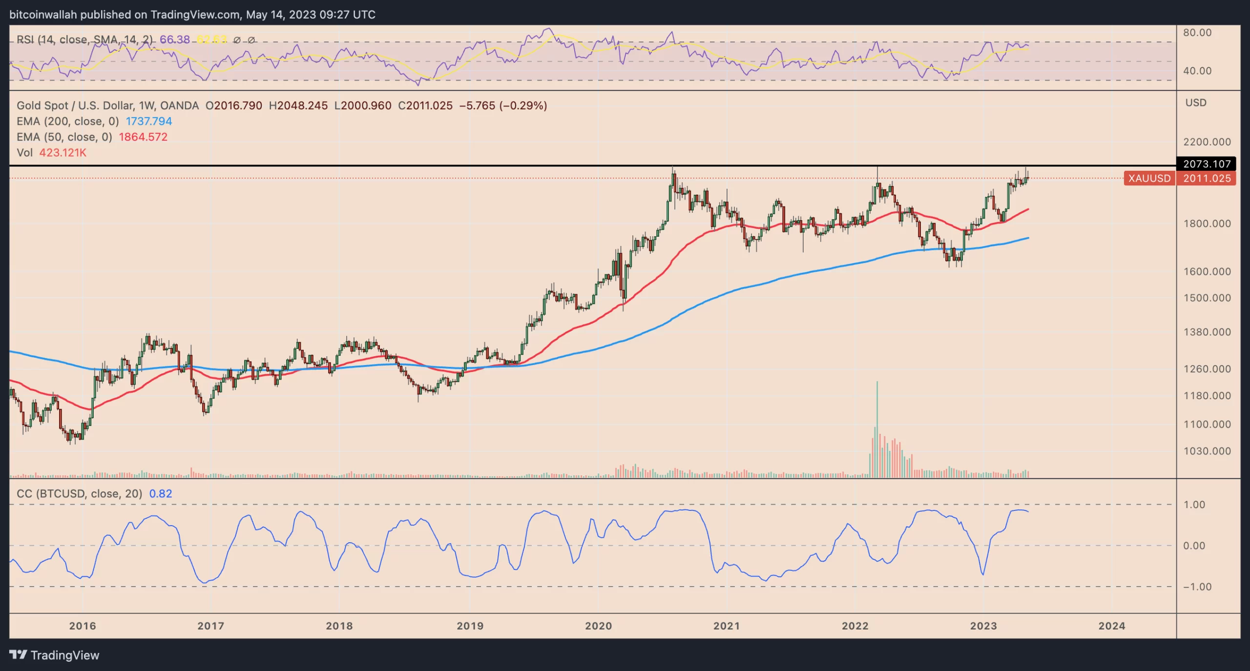 Giá vàng đã tăng gần 15% lên hơn 2.000 USD/ounce trong bối cảnh khủng hoảng ngân hàng. Mối tương quan tích cực với Bitcoin cũng đã phát triển mạnh mẽ hơn với hệ số hàng tuần của nó là 0,82 kể từ ngày 14 tháng 5.