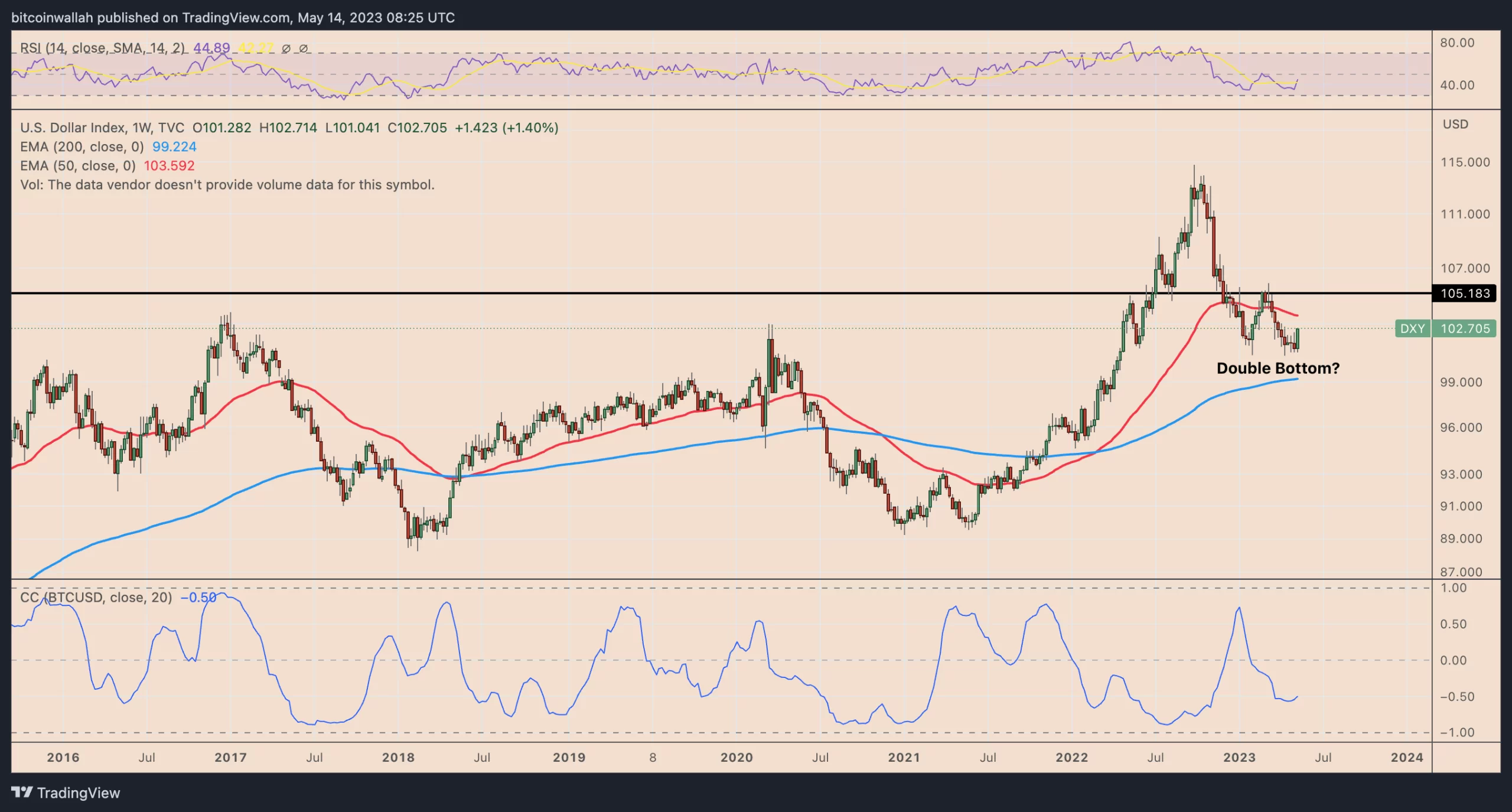Thật thú vị, sự tăng giá của đồng USD đã để lại một mô hình đáy kép tiềm năng, được xác nhận bởi hai điểm thấp gần mức giá ngang tương tự khoảng 100,75. Mô hình đáy kép là một thiết lập đảo chiều tăng giá, cho thấy DXY có thể tăng lên 105,85 trong vài tháng tới.