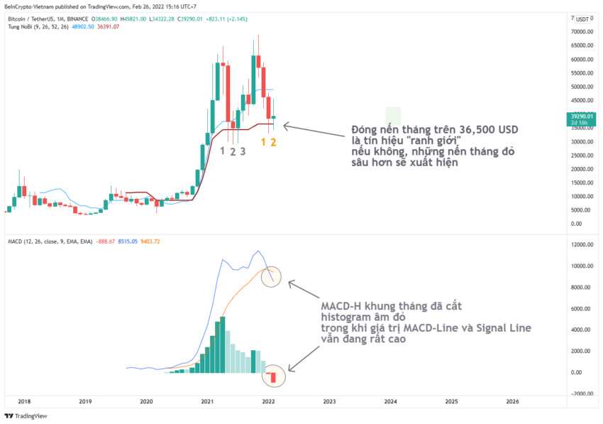 Tuy nhiên, tín hiệu xác nhận từ MACD-H rất mạnh mẽ để khẳng định thị trường đã bước vào cấu trúc downtrend kéo dài (Macd Line cắt Signal Line trong khi đang ở mức cao và histogram đã âm đỏ thanh thứ hai). Chỉ cần thêm một tín hiệu giá Bitcoin đóng cửa nến tháng dưới Kijun (khoảng 36,500 USD) thì hy vọng cho sự phục hồi gần như bị dập tắt.