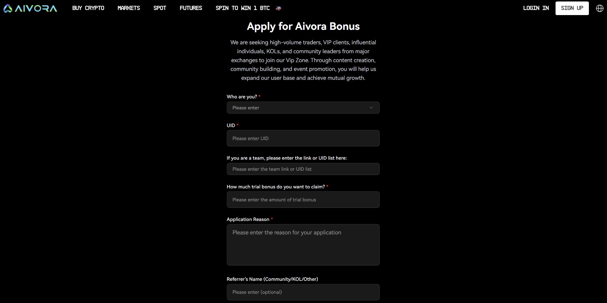 Trong khi phần lớn sàn giao dịch thường phát hành voucher qua các sự kiện giới hạn, Aivora Exchange đã đi ngược dòng bằng việc triển khai Apply Voucher, cho phép cộng đồng tự nộp đơn xin voucher giao dịch futures trực tiếp từ sàn mà không cần qua trung gian hay xét duyệt event.