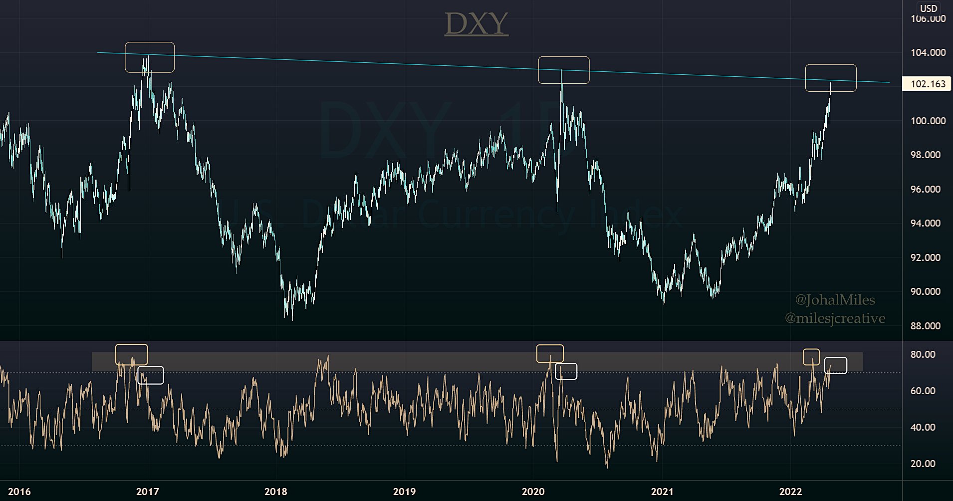 Theo nhà phân tích Miles J Creative, bạn có thể hiểu sâu hơn về điểm yếu trên các thị trường toàn cầu bằng cách xem xét hiệu suất mạnh mẽ của DXY, hiện đang ở mức giá cao nhất trong hai năm.