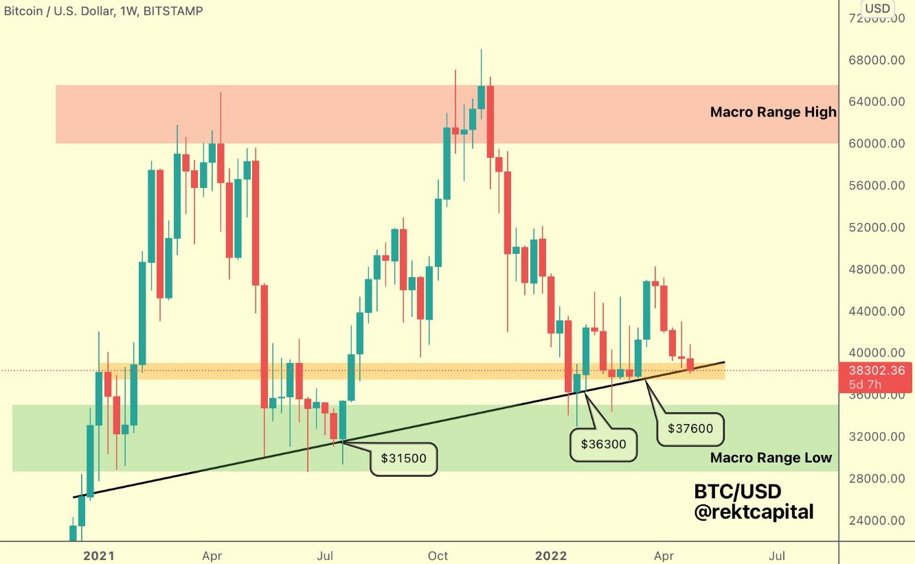 Việc bán tháo giá Bitcoin vào ngày 26 tháng 4 đã khiến nhiều nhà phân tích nhắc lại rằng chúng ta đang tiến tới đáy của thị trường gấu, nhưng không phải ai cũng có triển vọng tồi tệ như vậy, bao gồm nhà phân tích tiền điện tử và người dùng Twitter có biệt danh Rekt Capital, người đã đăng biểu đồ sau cho thấy giá đang kiểm tra lại vùng hỗ trợ chính.
