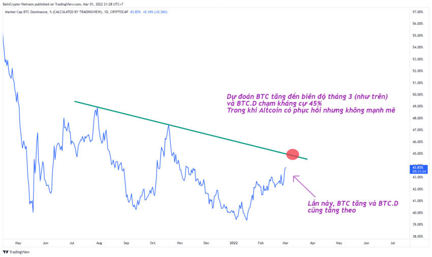Dự đoán BTC.D có khả năng tăng tiếp đến vùng 45% cùng với việc giá Bitcoin đi vào biên độ tháng 3 như nói ở trên. Và Altcoin sẽ có sự phục hồi nhưng không mạnh mẽ bằng.