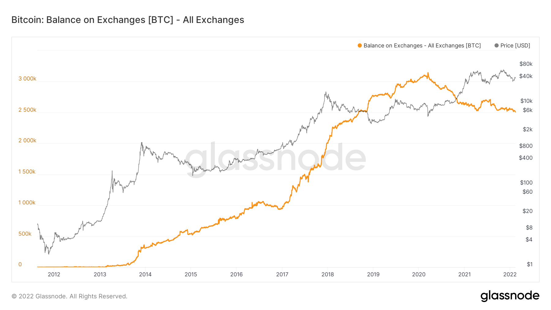 Ngoài ra, số lượng Bitcoin do các sàn giao dịch nắm giữ đã giảm vào ngày 13 tháng 2 xuống mức thấp nhất trong hơn ba năm, dữ liệu từ Glassnode cho thấy.