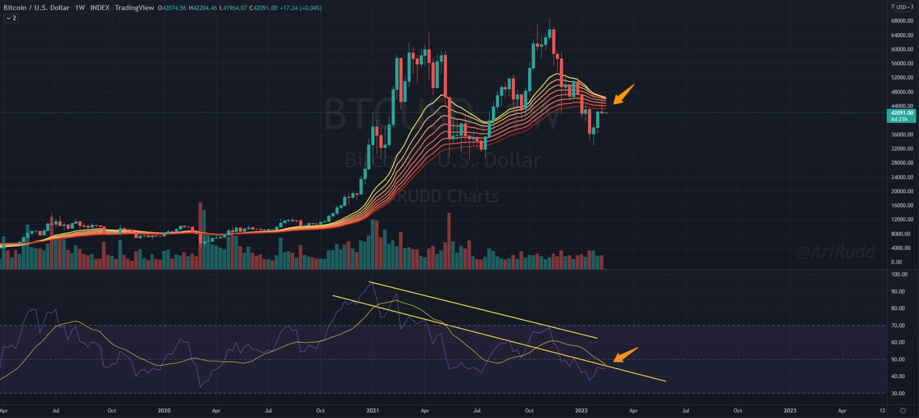 “Mức kháng cự mạnh”, như Rudd gợi ý, cung cấp thêm tâm lý giảm giá nếu kết hợp với chỉ số sức mạnh tương đối hàng tuần (RSI) của Bitcoin.