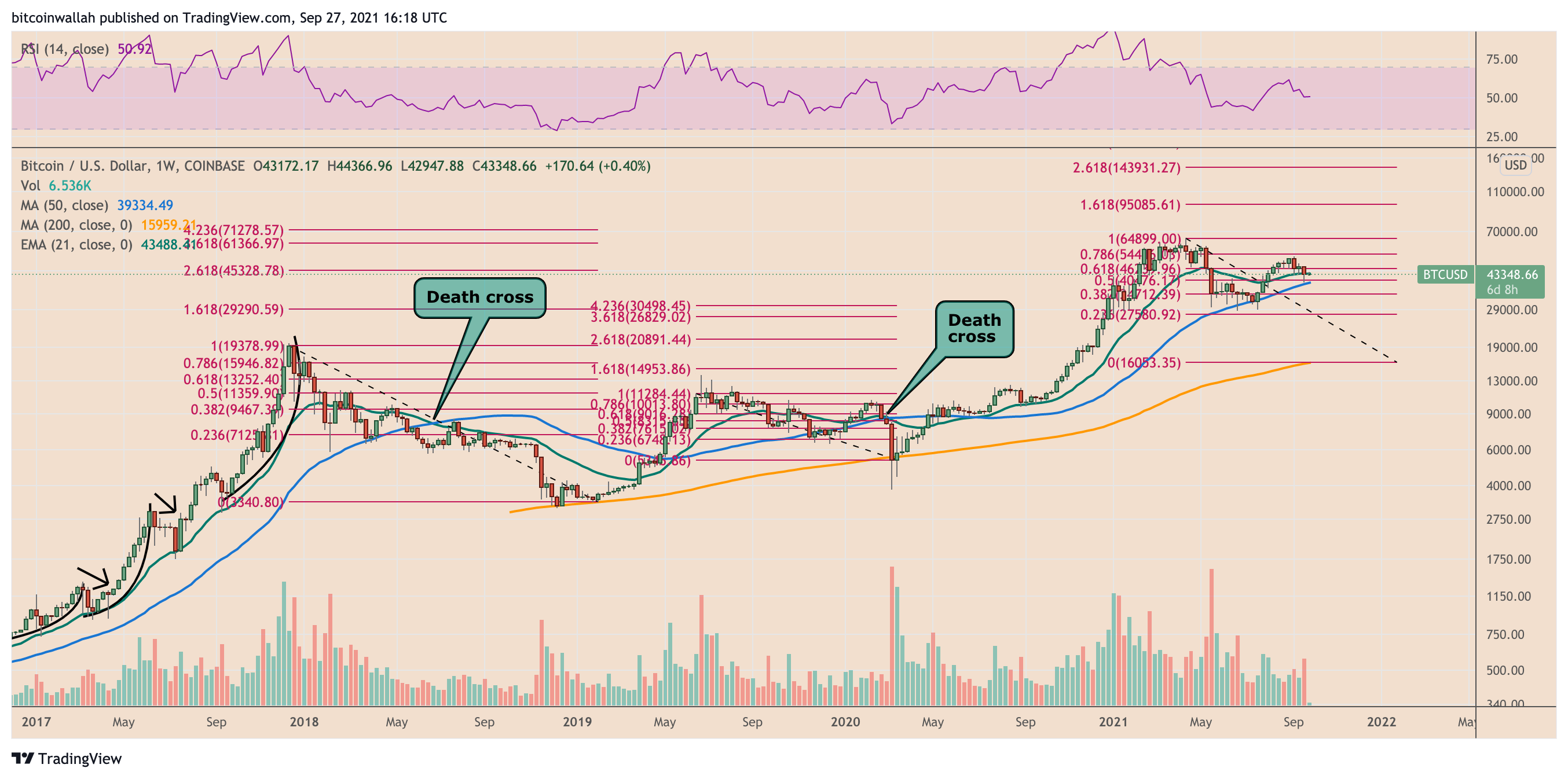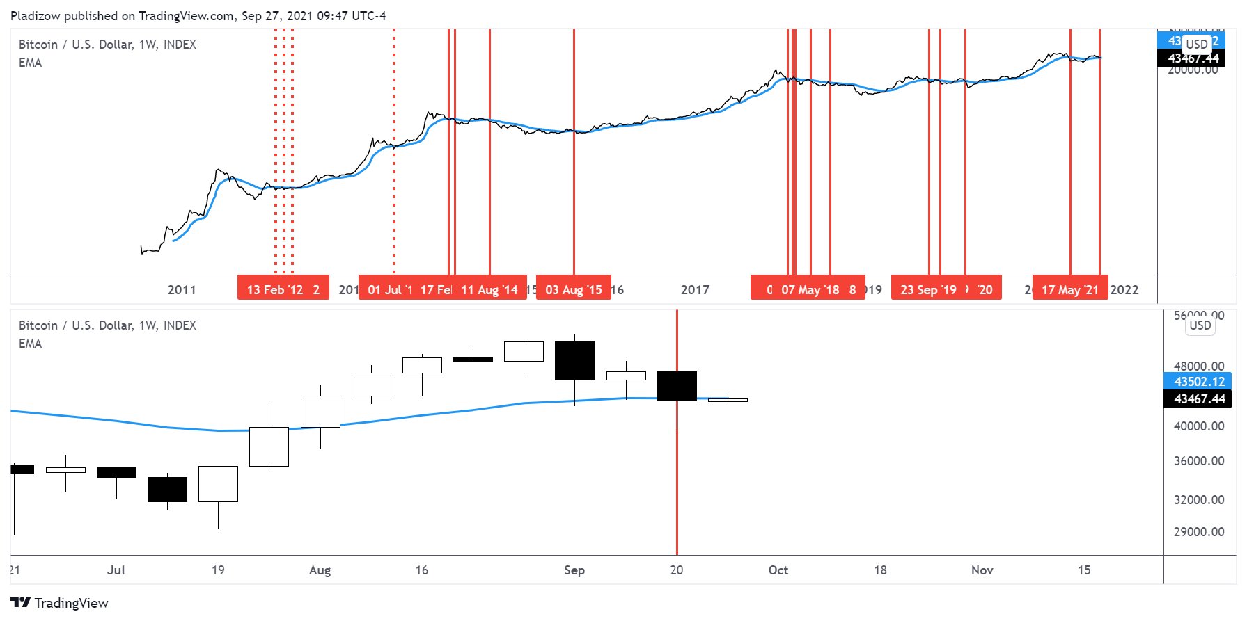 Bitcoin đã đóng cửa tuần kết thúc vào ngày 26 tháng 9 ở mức 43.178 USD, cảnh báo về sự sụt giảm lịch sử thứ 19 của nó dưới đường EMA 21 tuần — khoảng 43.502 USD vào lúc đóng cửa hàng tuần.