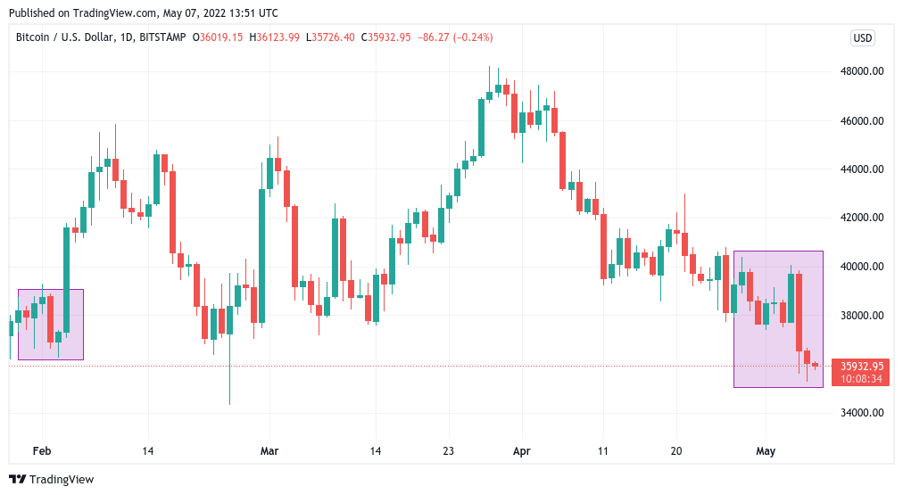 Dữ liệu từ TradingView cho thấy BTC xoay quanh mốc 36.000 USD vào ngày 7 tháng 5 sau khi mất 12% chỉ trong 72 giờ.