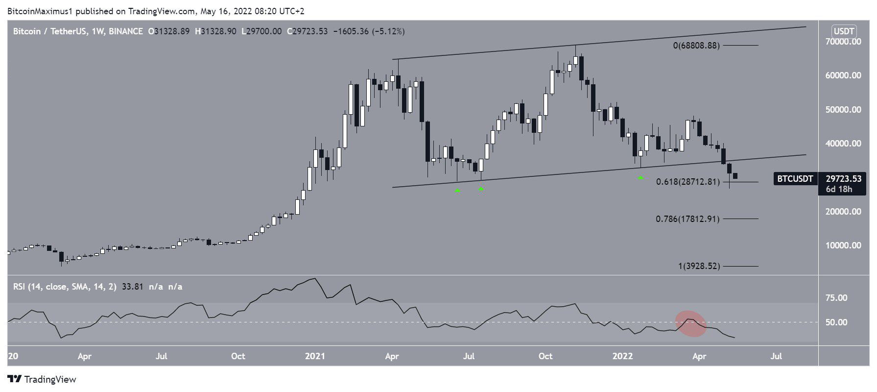 Kể từ tháng 4 năm 2021, đường hỗ trợ của kênh đã được kiểm tra ba lần (biểu tượng màu xanh lá cây), gần đây nhất là vào tháng 1. Vào đầu tháng 5, giá cuối cùng đã phá vỡ khỏi kênh. Sau đó, nó tiếp tục đạt mức thấp nhất là 26.700 USD vào ngày 12 tháng 5, được thực hiện ngay trên mức hỗ trợ thoái lui 0,618 Fib.
