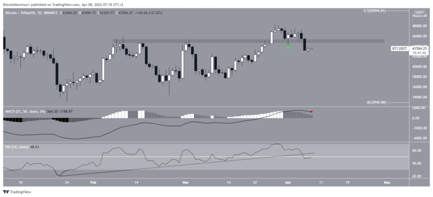 Biểu đồ hàng ngày cung cấp một bức tranh tiêu cực hơn, cho thấy xu hướng giảm giá. Theo đó, BTC đã giảm kể từ khi đạt mức cao nhất trong khoảng thời gian đó, là 48,189 USD vào ngày 28 tháng 3. Ban đầu, giá bật lên ở vùng ngang 44,800 USD vào ngày 1 tháng 4 (biểu tượng màu xanh lá cây). Điều này dường như đã xác nhận khu vực này là ngưỡng hỗ trợ.