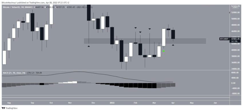 Biểu đồ hàng tuần cho thấy rằng Bitcoin vẫn đang giao dịch trên khu vực 43,000 USD. Mức này đã đóng vai trò là ngưỡng hỗ trợ từ tháng 11 năm 2021 trước khi chuyển sang ngưỡng kháng cự vào tháng 2 năm 2022. Có thể khu vực này sẽ hoạt động như mức hỗ trợ một lần nữa.