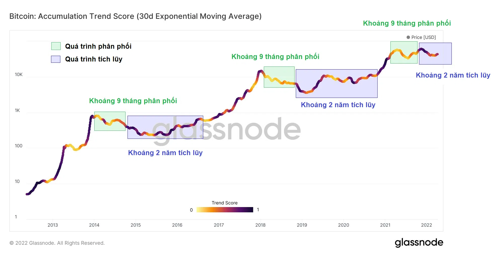 - Phân tích trên cho rằng, Bitcoin đã hoàn thành 9 tháng phân phối từ tháng 1/2021 đến hết tháng 10/2021. Đây cũng là khoảng thời gian mà Bitcoin lập ATH mới lần đầu tiên ở 65,000 USD.