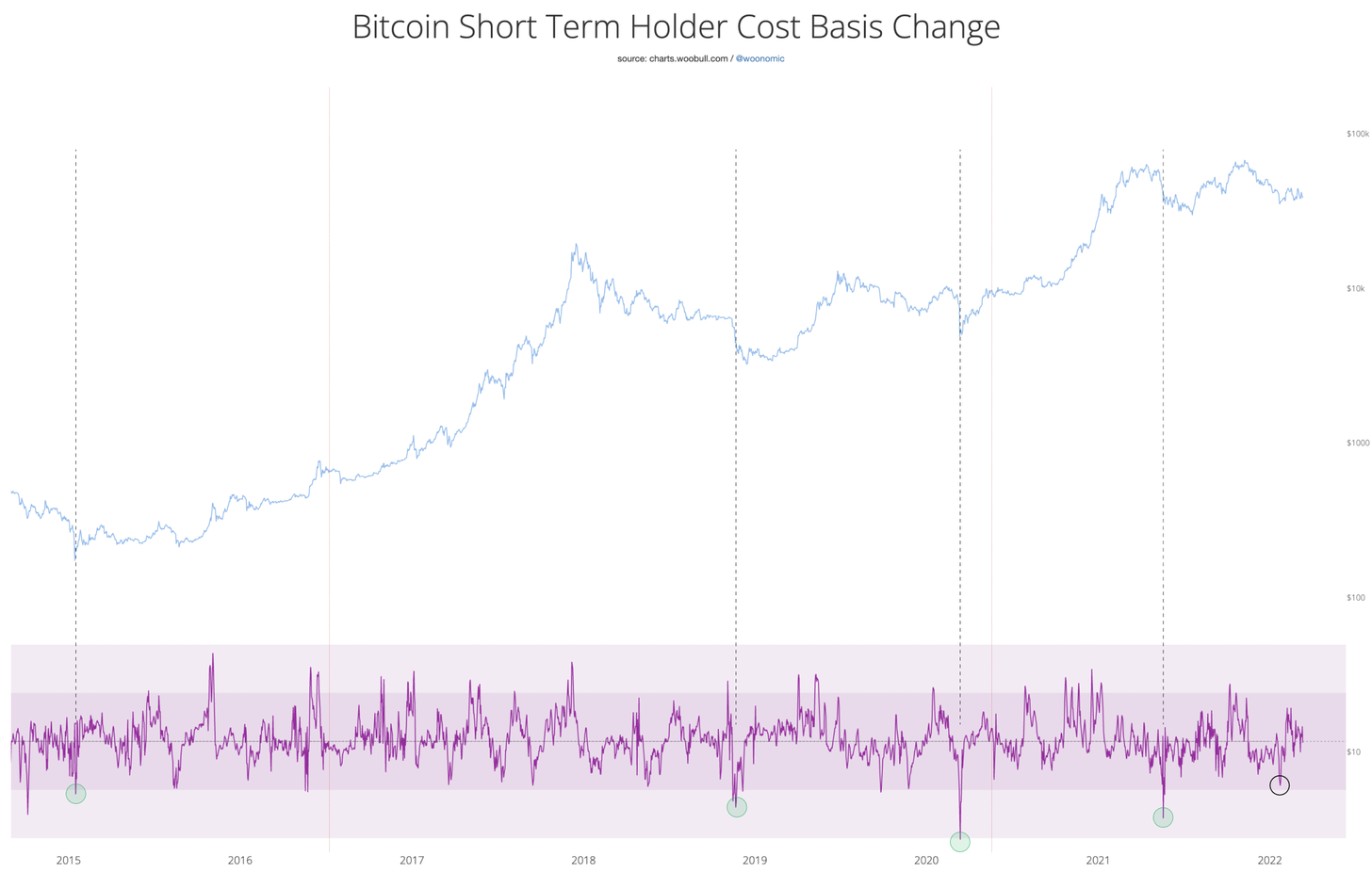 Woo đã đánh giá mức giá trung bình mà các nhà đầu tư ngắn hạn tham gia vào thị trường Bitcoin trong suốt lịch sử và lập biểu đồ về sự thay đổi hàng ngày của giá trị. Điều đó dẫn đến cơ sở chi phí, một số liệu báo hiệu khi các trader “thiếu kinh nghiệm” bán BTC cho các trader “có kinh nghiệm” trong thời gian BTC rơi tự do, thường trùng với đáy thị trường.