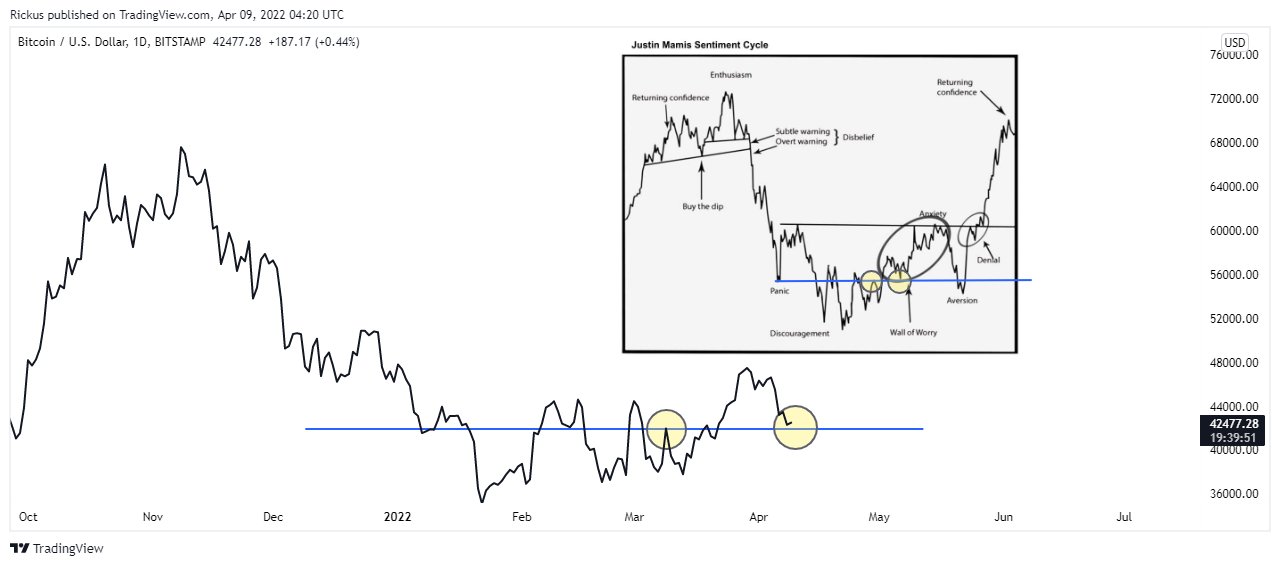 Nhà phân tích cũng chỉ ra rằng cả biểu đồ BTC và DJI dường như đang mô phỏng một mô hình được gọi là Chu kỳ cảm xúc, ban đầu được phổ biến bởi kỹ thuật viên thị trường chứng khoán Justin Mamis trong cuốn sách “The Nature of Risk”.
