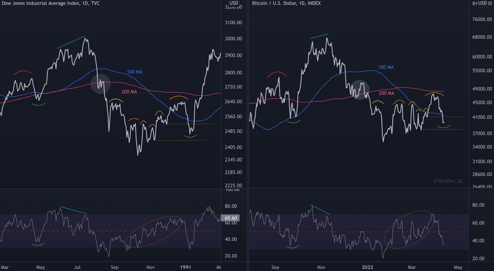Trong một tweet mới, nhà phân tích có bút danh nổi tiếng TechDev cho 383.000 người theo dõi trên Twitter của mình thấy một biểu đồ có những điểm tương đồng nổi bật giữa Chỉ số Trung bình Công nghiệp Dow Jones (DJI) vào năm 1991 và Bitcoin ngày nay.