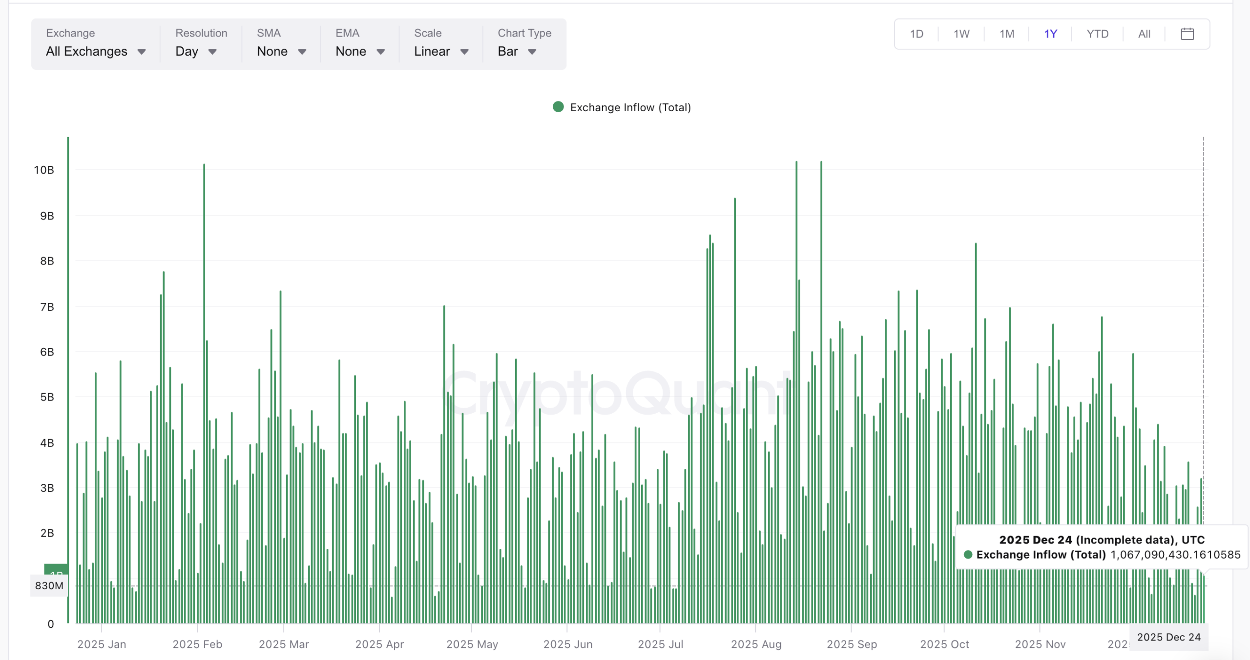 Tổng lượng stablecoin ERC-20 nạp vào các sàn chạm đỉnh khoảng 10.2 tỷ USD vào ngày 14/08. Đến ngày 24/12, con số này chỉ còn khoảng 1.06 tỷ USD, giảm gần 90%.