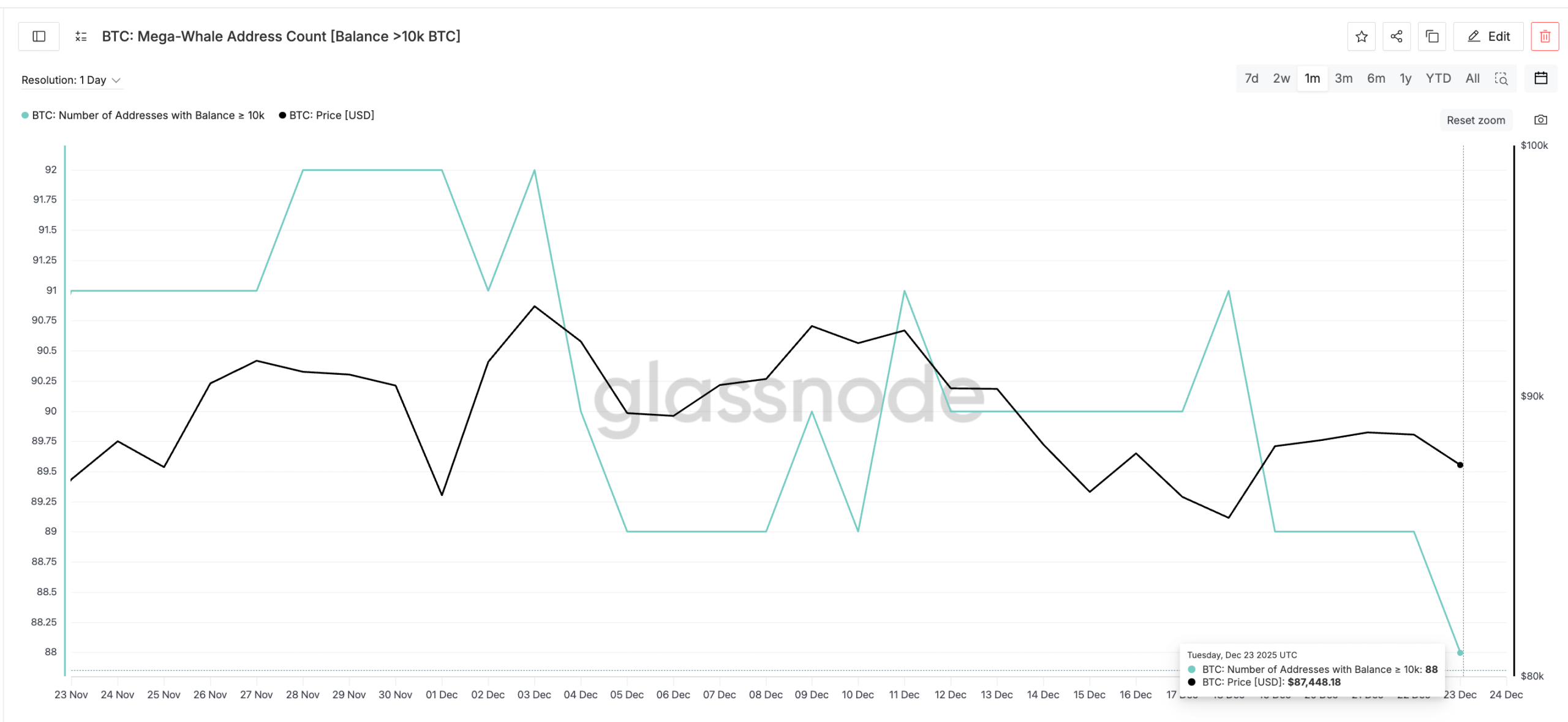 Số lượng ví Bitcoin nắm giữ trên 10,000 BTC đã giảm từ 92 ví vào đầu tháng 12 xuống còn 88 ví. Sự sụt giảm này xuất hiện cùng thời điểm với giá Bitcoin giảm, chứ không phải do tích lũy thêm.