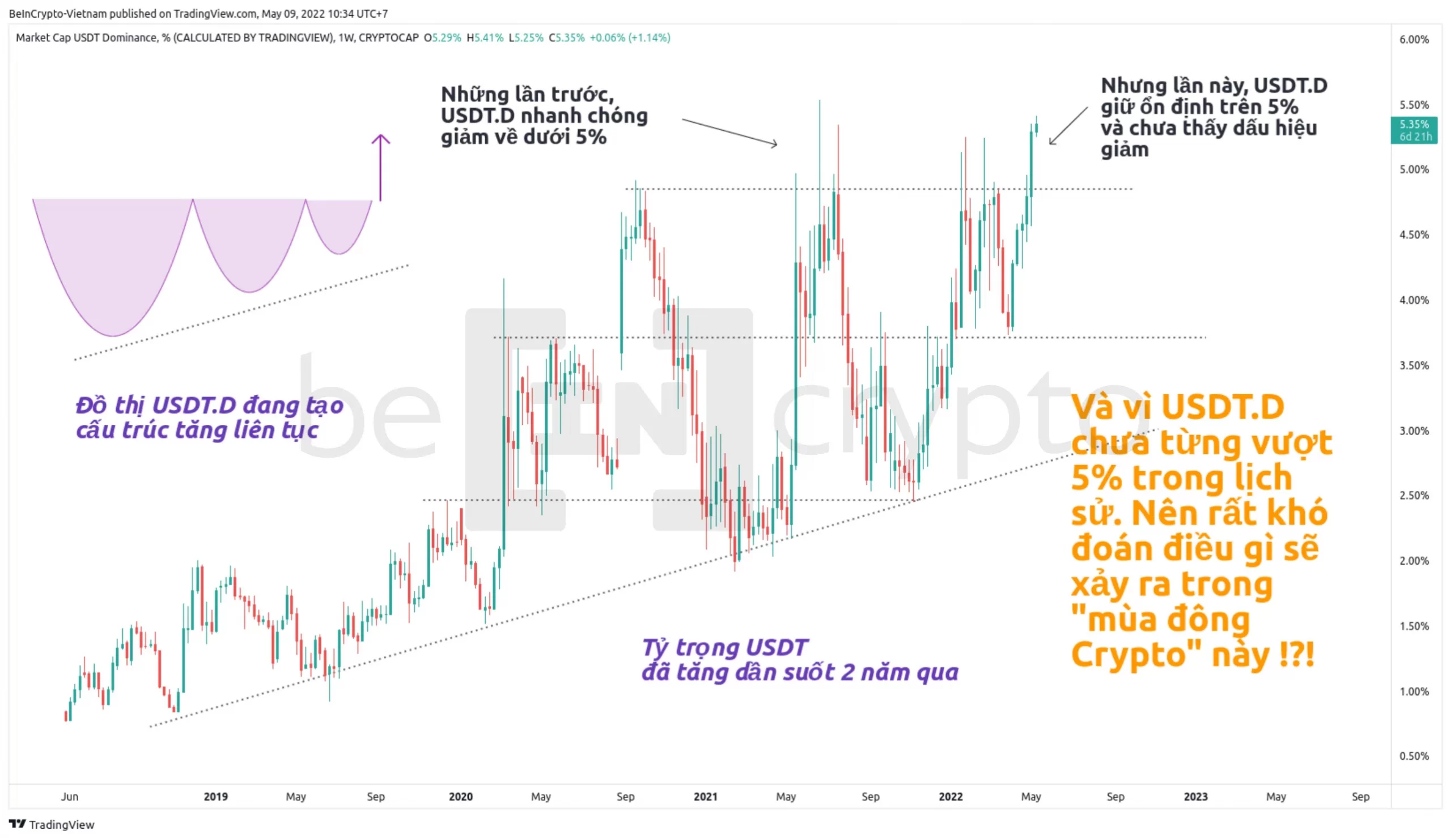 Và vì USDT.D chưa từng vượt và giữ trên 5% trong lịch sử, nên rất khó để đoán điều gì tiếp theo sẽ xảy ra, nhất là lúc “mùa đông crypto” đến gần.