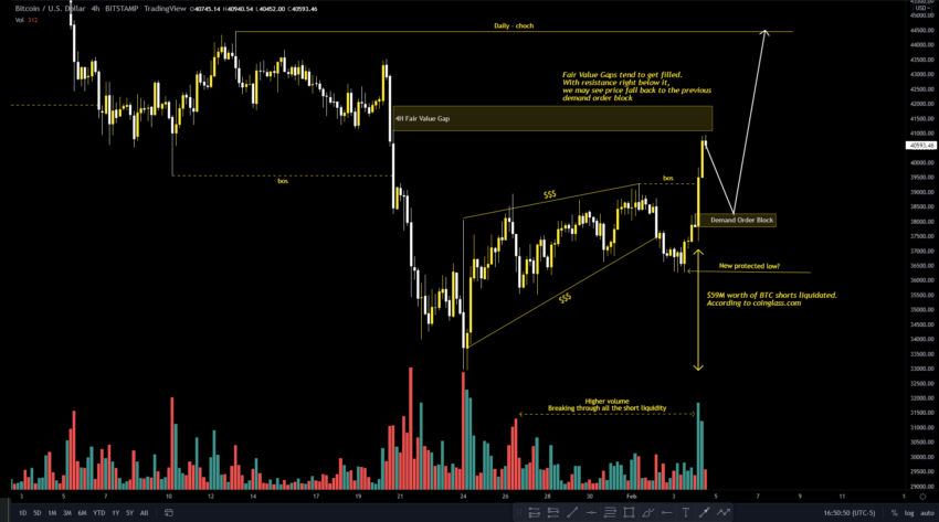 Từ ngày đầu tháng hai, nhiều phân tích đã nhìn thấy xuất hiện tín hiệu phục hồi khung 4h, BTC có thể tăng đến 43,000 USD, và hôm này khả năng này càng gần hơn.