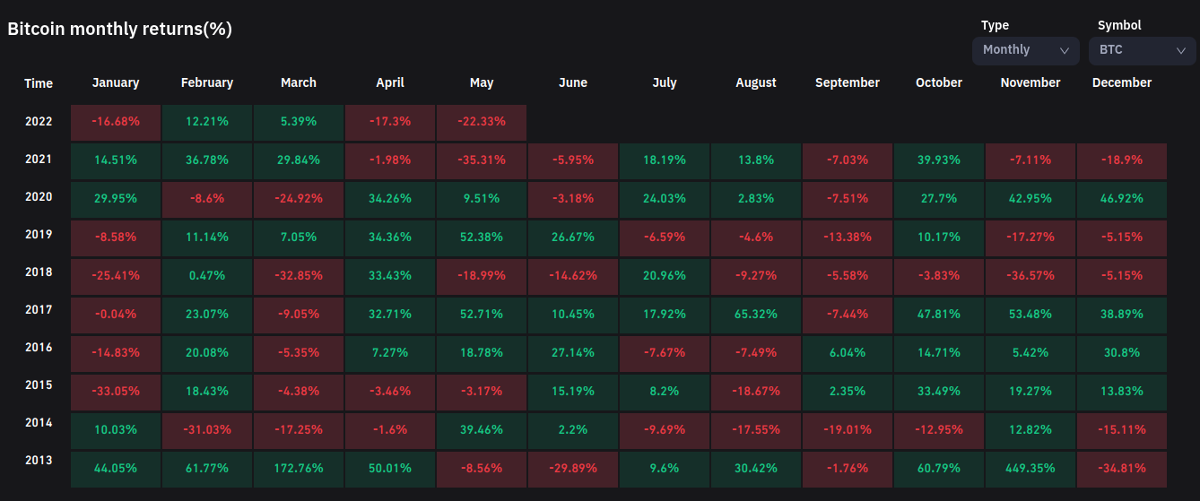 Dữ liệu từ tài nguyên phân tích trên chuỗi Coinglass cho thấy lợi nhuận hàng tháng hiện tổng cộng là -22% đối với Bitcoin, mức giảm lớn nhất trong bất kỳ năm nào ngoại trừ năm 2021 là -35%.