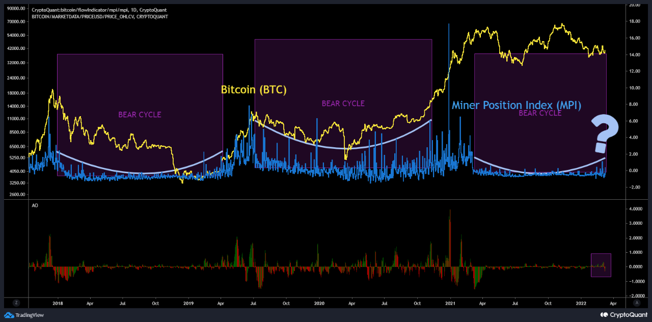 Miners’ Position Index (MPI) một chỉ số theo dõi tỷ lệ BTC rời khỏi ví của thợ đào. Nói một cách đơn giản hơn, chỉ số này cho chúng ta biết hành vi bán hàng của thợ đào hiện tại như thế nào so với mức trung bình trong năm qua.
