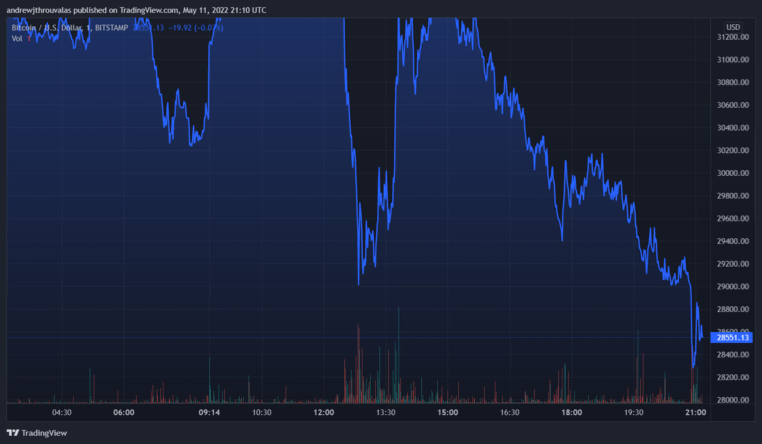 Giá Bitcoin đã phá vỡ xuống dưới 30.000 USD, chạm mức 28.228 USD chỉ vài giờ trước. Đó là mức giá rẻ nhất của Bitcoin kể từ ngày 4 tháng 1 năm 2021.