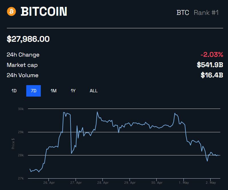 Giá bitcoin đã giảm 2% trong ngày xuống dưới 28.000 USD tại thời điểm viết bài. BTC đạt mức thấp nhất trong ngày và hàng tuần là 27.722 USD trong phiên giao dịch buổi sáng châu Á.