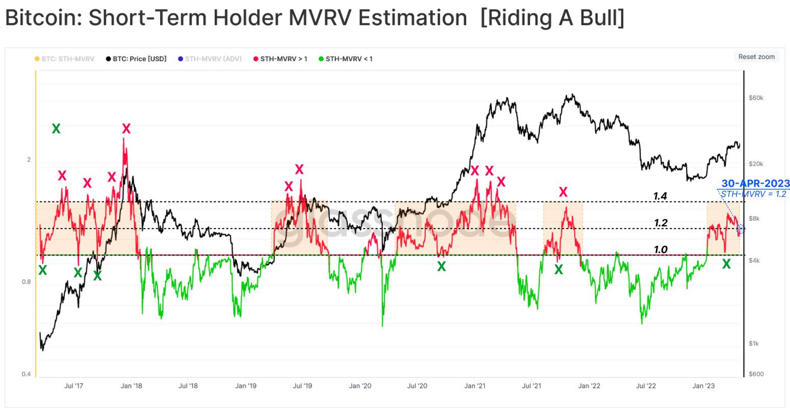 Bitcoin đã điều chỉnh 10% so với mức cao nhất năm 2023 gần 31.000 USD vào giữa tháng Tư. Tuy nhiên, thị trường có thể giảm hơn nữa so với mức giá hiện tại khoảng 28.000 USD.